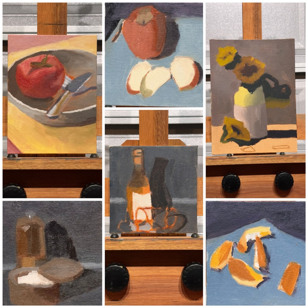 I painted a variety of still life paintings, some from life, others from photographs. Many of them were on cheap 6″x6″ canvas panels.