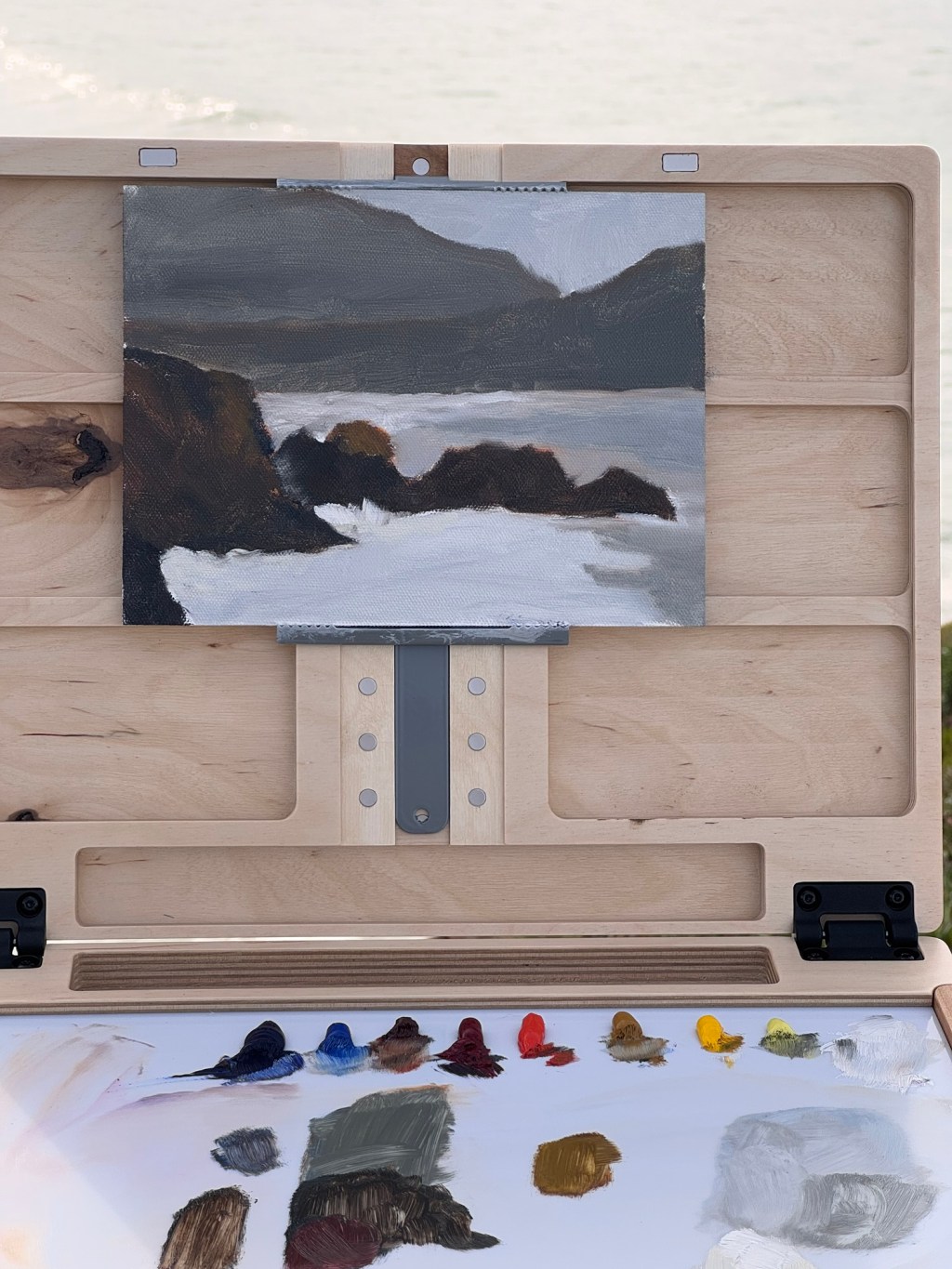 In the end, this was a really challenging painting because the fog was lifting while I was painting which really changed what I was looking at. Here are some progress shots and the painting I ended up with: