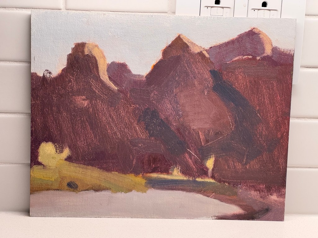 For starters (and for better or for worse), this workshop was not about creating beautiful paintings of the breathtaking landscape. This landscapes focus was on creating color studies – accurate value and temperature representations of the scenes in front of us. Mitch Baird, the instructor, defined success as a completed “start” or block-in, where the major shapes in the painting are defined with the correct value (lightness/darkness) and temperature (color). That proved to be a lot harder than it sounds, especially in a new landscape.